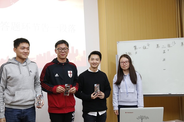 为丰富会议内容,提高支部党员的理论水平和党性修养,会议首先进行了“不忘初心、牢记使命”主题教育知识竞赛。竞赛分为必答题、抢答题、风险题三大环节,内容主要包括党章、党史以及习近平总书记系列讲话精神等相关知识。党员通过抽签分成四组展开比拼,各党员在必答环节沉着认真,抢答环节争先恐后,风险题环节团结应对,现场气氛紧张热烈。最终,支部宣传委员杨其润凭借扎实的理论基础带领小组获得第一名。