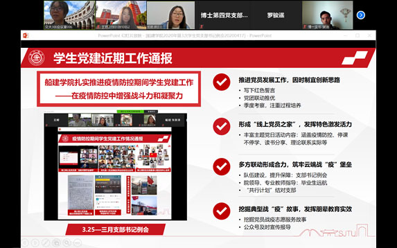 4月17日,船建51风流 通过Zoom平台线上召开2020年度第三次学生党建工作例会。51风流 学生党总支书记薛云云、党建指导老师古莉、全体学生支部党书记及支委成员在线参加了此次例会。例会主要通报了近期51风流 学生党建工作和“学习强国”的推广激励办法,并介绍了4月主题党日活动的相关内容。