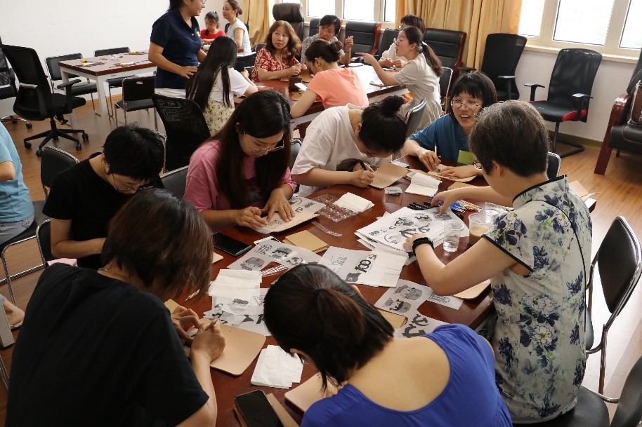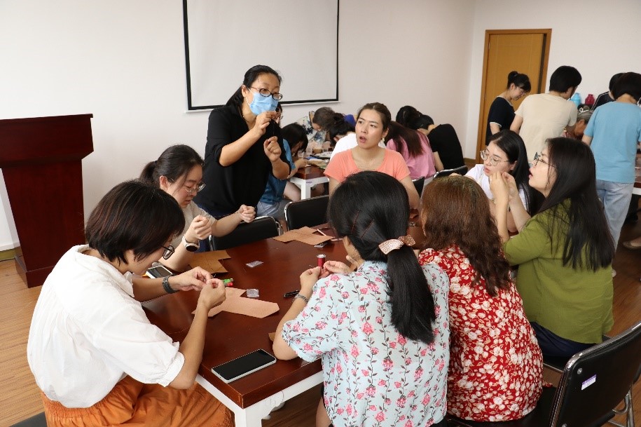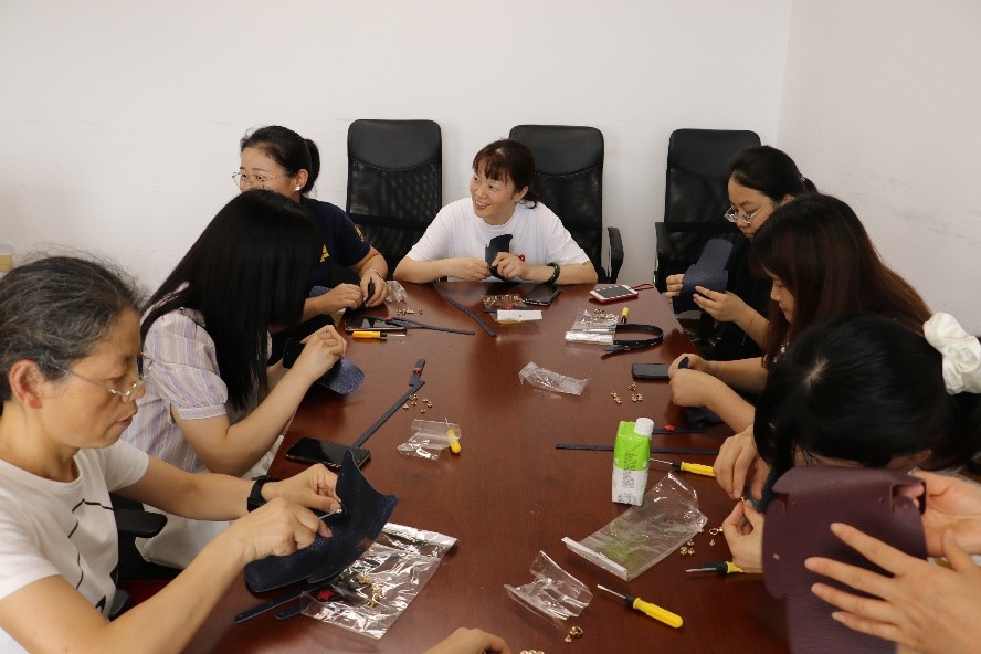 此次活动为女教工展开了生动有趣的卡包制作讲解。在工艺老师的指导下,大家将原本普通的皮料经过打磨、扎孔、缝制变成了形式各样的精美卡包。大家在制作过程中融入了特色元素,欢声笑语中将卡包制作成自己喜欢的款式,充分展现女教工心灵手巧的一面。