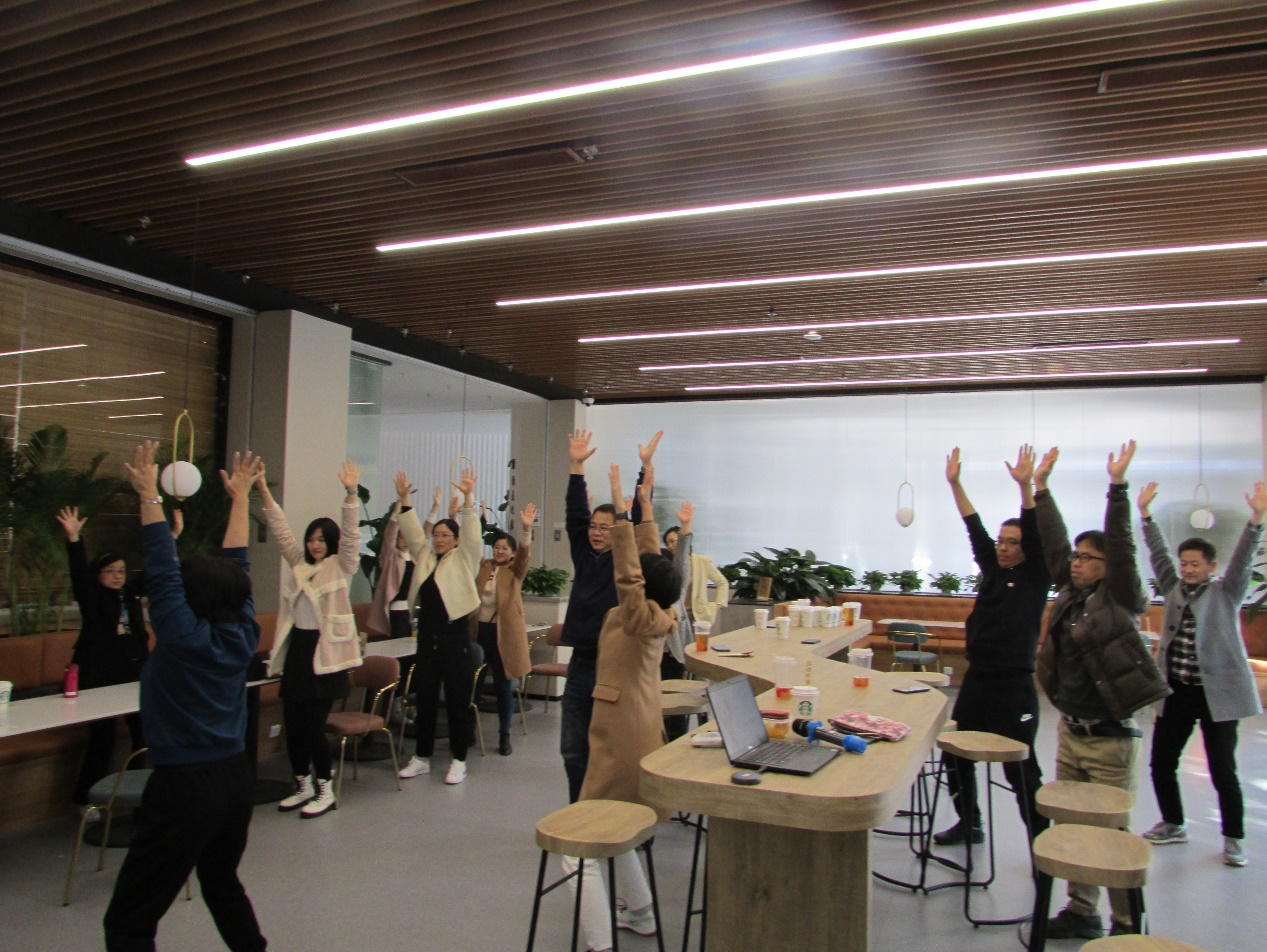 姚老师现场亲自示范正确的运动方式,带领老师们在工作之余身心放松。
