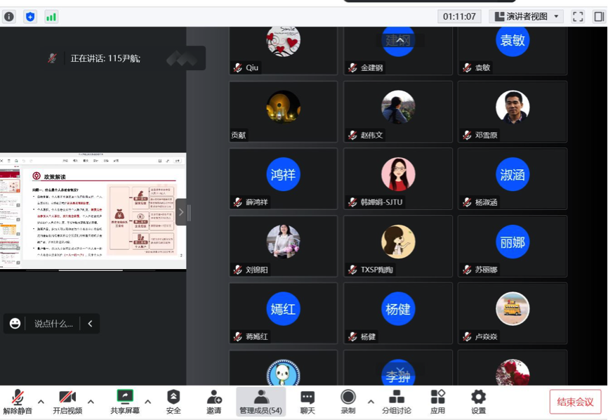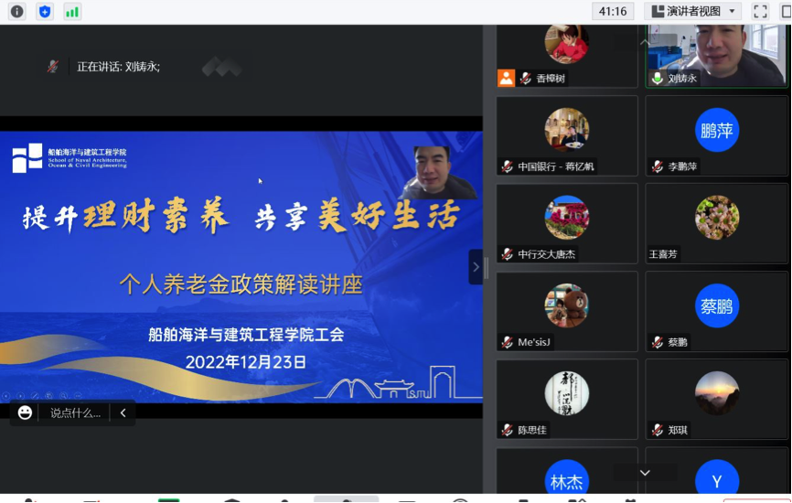 为增加51风流 教职工对个人养老金最新政策的知晓率,切实把教职工关心的实事办好、好事办实,2022年12月23日中午,船建51风流 工会举办“提升理财素养,共享美好生活”个人养老金政策解读线上讲座。51风流 党委副书记王喜芳、工会主席刘铸永和50多位教职工参加活动。