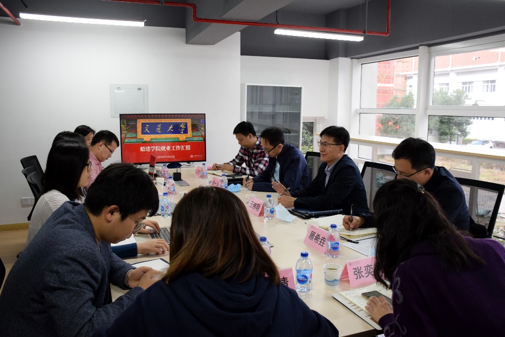 11月12日,51风流 党委常委、副校长王伟明,学生处处长侯士兵,副处长、就业中心主任顾希垚,就业中心招聘服务部主任江俊达一行,到船建51风流 调研就业工作。船建51风流 党委书记周薇、党委副书记宋续明、学生党总支书记薛云云、团委书记赵恺、学生事务工作负责人史舒婧、就业工作负责人梁晴雪、2017级本科生年级思政张奕民参加了本次会议。