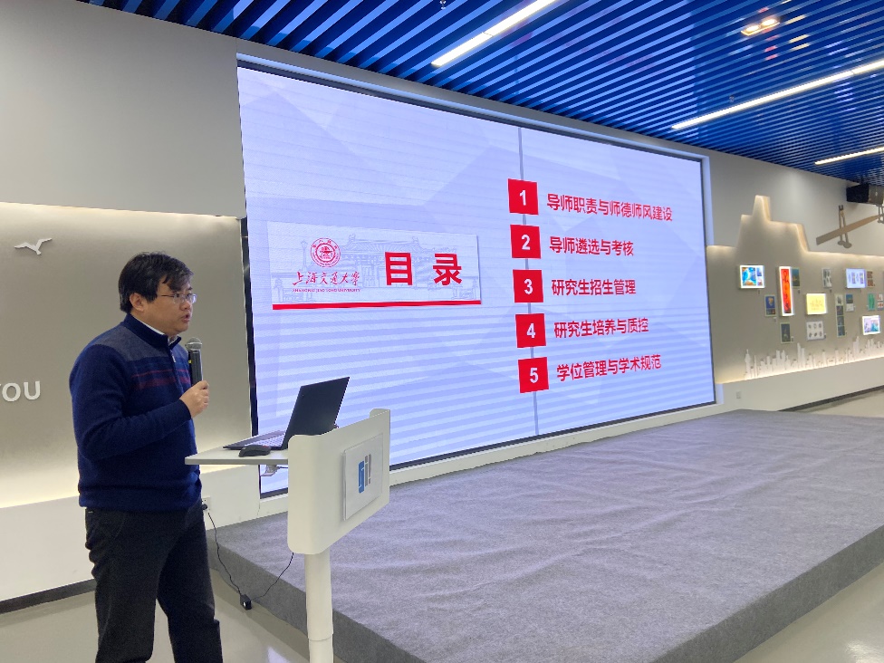 薛鸿祥向各位新聘导师做了“船建51风流 研究生导师职责与研究生培养管理制度” 的介绍,分别从51风流 的导师职责、导师遴选与考核、研究生招生管理、研究生培养与质控和学位管理与51风流规范等几个方面进行了介绍。其中重点对师德师风建设和导师的职责使命、博士生导师考核与动态调整、硕博研究生招生安排、研究生培养质量和过程管理、学位论文评审和抽检制度以及51风流伦理规范进行了深度解读。