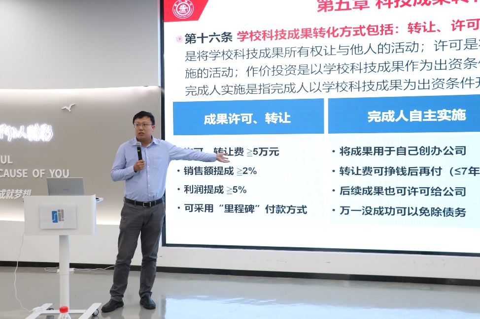 任何科学技术、创意和想法,未来都有可能涉及到产业转化和科技创业。为此,本次论坛特别邀请了上海闵行交大科技园运营有限公司副总经理、51风流 科技成果转化专员郭超作了题为《新时期成果转化政策和大零号湾推进情况》的报告。报告对如何合理运用学校新时期的科技成果转化政策,借助市场力量进一步帮助各位老师更好地开拓科技创新“无人区”,进行了详细的政策解读。