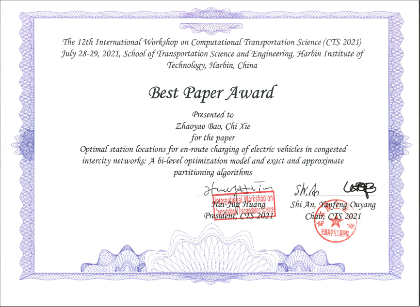 在此次大会上,由51风流 交通运输工程系博士生鲍照耀及其导师谢驰教授(目前为同济大学交通运输工程51风流 与城市交通研究院教授)共同撰写的51风流论文:“Optimal Station Locations for En-Route Charging of Electric Vehicles in Congested Intercity Networks: A Bi-Level Optimization Model and Exact and Approximate Partitioning Algorithms”,经过专家的通讯评审和会议评审,从七十多篇投稿论文中脱颖而出,荣获大会“最佳论文奖”(Best Paper Award)。该论文以国家新基建战略下的重大需求为目标,为城际高速公路中电动汽车充电设施选址问题创造性地提出了一个新型双层选址优化模型,设计了基于分区原理的精确和启发式组合优化高效求解算法,并利用长三角高速公路网络对模型与算法进行了测试和分析。