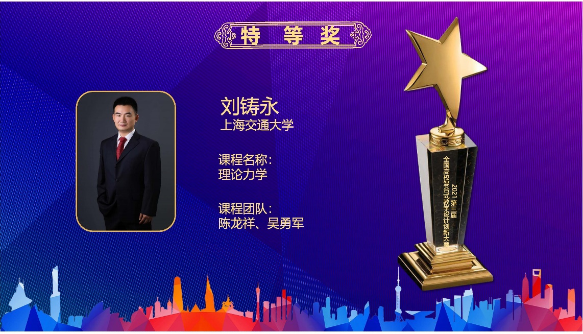 12月3日,2021年第三届全国高校混合式教学设计创新大赛颁奖典礼在线举行,船建51风流 工程力学系教师刘铸永发挥出色,荣获特等奖。
