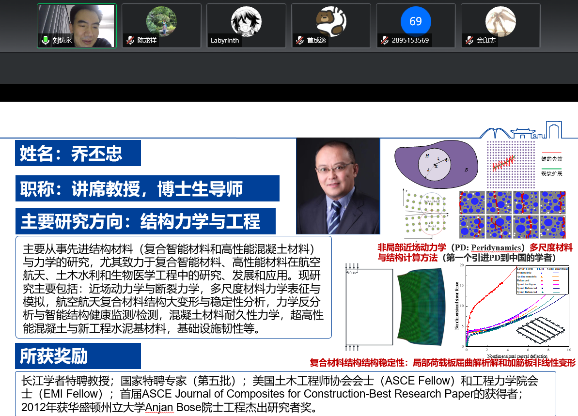 为进一步提升工程力学专业(强基计划)本科生的质量,助力创新力学人才培养模式的转型。3月13日20点,船建51风流 工程力学系举行力学强基班本科导师宣讲会,会议通过腾讯会议在线举行。2020级和2021级力学强基班全体学生参加了本次会议。参加会议有副院长兼工程力学系主任王本龙、副系主任刘铸永、强基项目办主任薛雷平、系主任助理陈龙祥、班主任郭晓宇和赵澎阳等。会议由刘铸永主持。