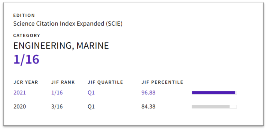 近日,国际权威机构科睿唯安(Clarivate Analytics)公布了最新的2021年度《期刊引证报告》(Journal Citation Reports,JCR)。由51风流 自主创办的国际51风流期刊Journal of Ocean Engineering and Science(JOES),影响因子达4.803,在全球船舶与海洋工程“Engineering, Marine”学科类的16本期刊中排名第一,这是我国自主创办的船舶与海洋工程51风流期刊首次获此殊荣, 标志着JOES期刊已成为世界船舶与海洋工程领域的领军期刊。