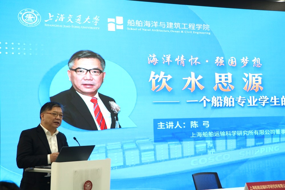 陈弓为全体师生带来《饮水思源——一个船舶专业学生的择业思考》主题报告。陈弓首先谈了自己对于职业规划的认识,教育同学们“立功、立德、立言”,把“立大志、明大德、成大才、担大任”作为人生追求。同时,陈弓以船舶设计与制造专业1990届校友的身份,分别从全球经济、海洋工程、专业挑战性、中国经济发展与海洋强国战略四个维度为各位学弟学妹们传授择业思考。他以自己的亲身经历为切入点,教育学弟学妹们作为交大学子,应时刻谨记“饮水思源、爱国荣校”校训,充分利用好自身核心竞争力,从船舶出发,但不囿于船舶,提出择业的“船舶+N”选择。