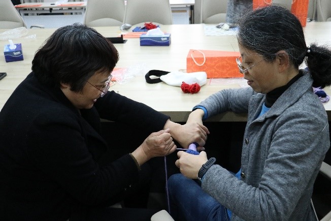 此次养生锤制作材料主要有民族手工布和养生中草药,制作工序包括倒药材、缠棉线、打绳结等,能锤打经络,能舒缓疲劳,起到养生保健的功效。大家跟随手工老师,从民族手工布中,挑选棉麻布,展开平铺,填放草药,用力按压,绑扎成圆,打结绑紧,一个个朴素典雅、药香扑鼻的实用养生锤制作完成。