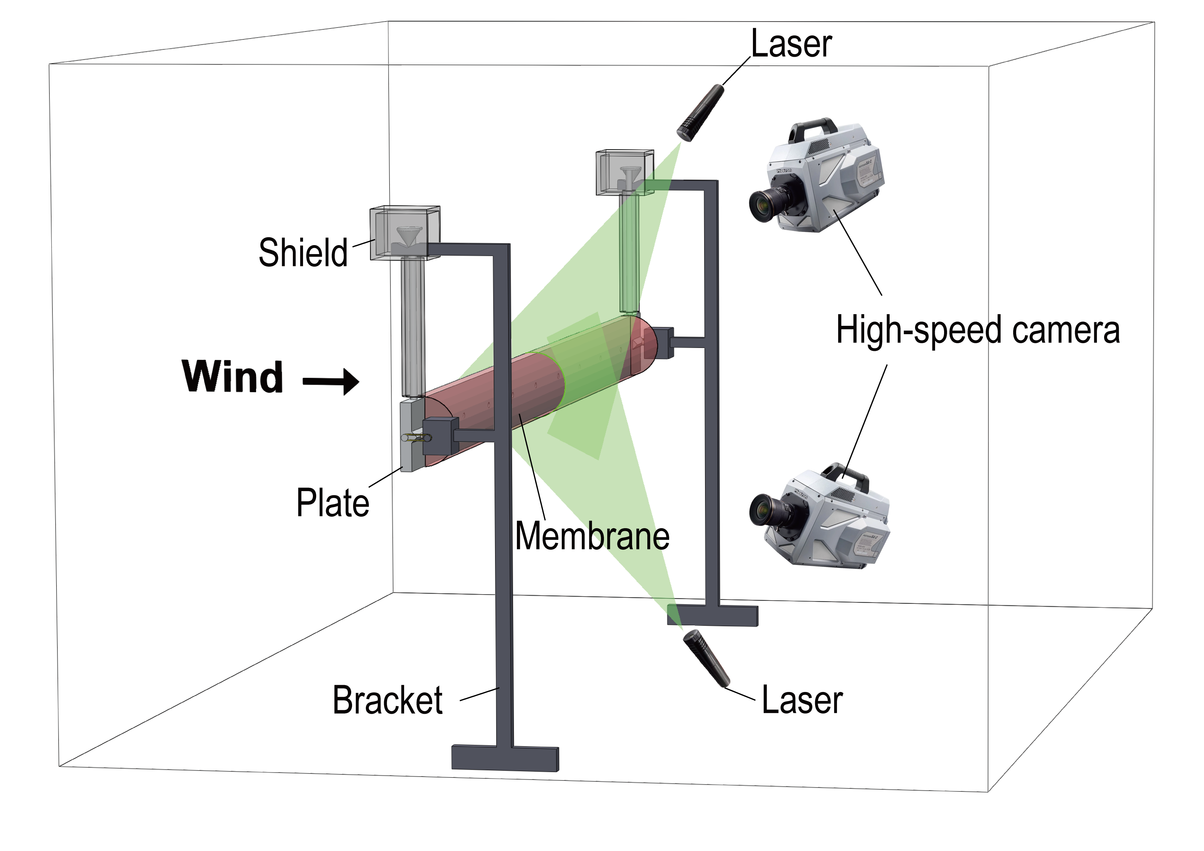 从2020年开始,研究小组在船海工程试验中心风洞循环水槽的支持下,逐步证明了 “软尾减阻”方法的工程实用性。首先在风洞实验室中构造了“软尾减阻”的三维实验模型,即“刚性平板+柔性薄膜”耦合系统。然后,建立了一套精密的测量系统(图1):设计了悬挂系统释放约束来提升测力精度,开发了基于激光和高速摄像机的柔性薄膜高时空分辨率测量方法,研制了尾流烟线显示方法和装置。为了解决薄膜在大风中被吹瘪或吹破的问题,研究小组还提出了在平板正面开若干小孔来平衡薄膜内外压强的方法,不仅缓解了薄膜在风载作用下所受的张力,还使得薄膜在任何风速下均可达到鼓涨的效果。