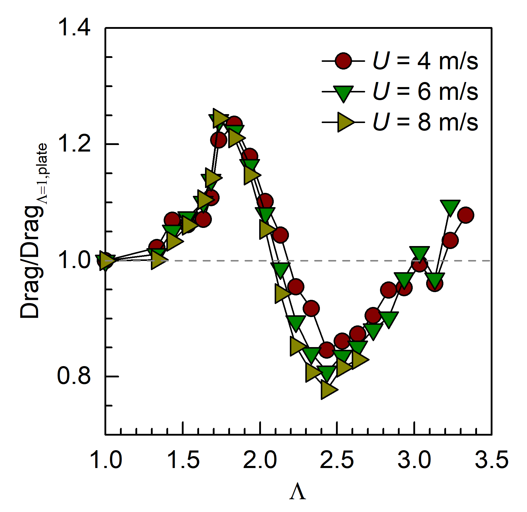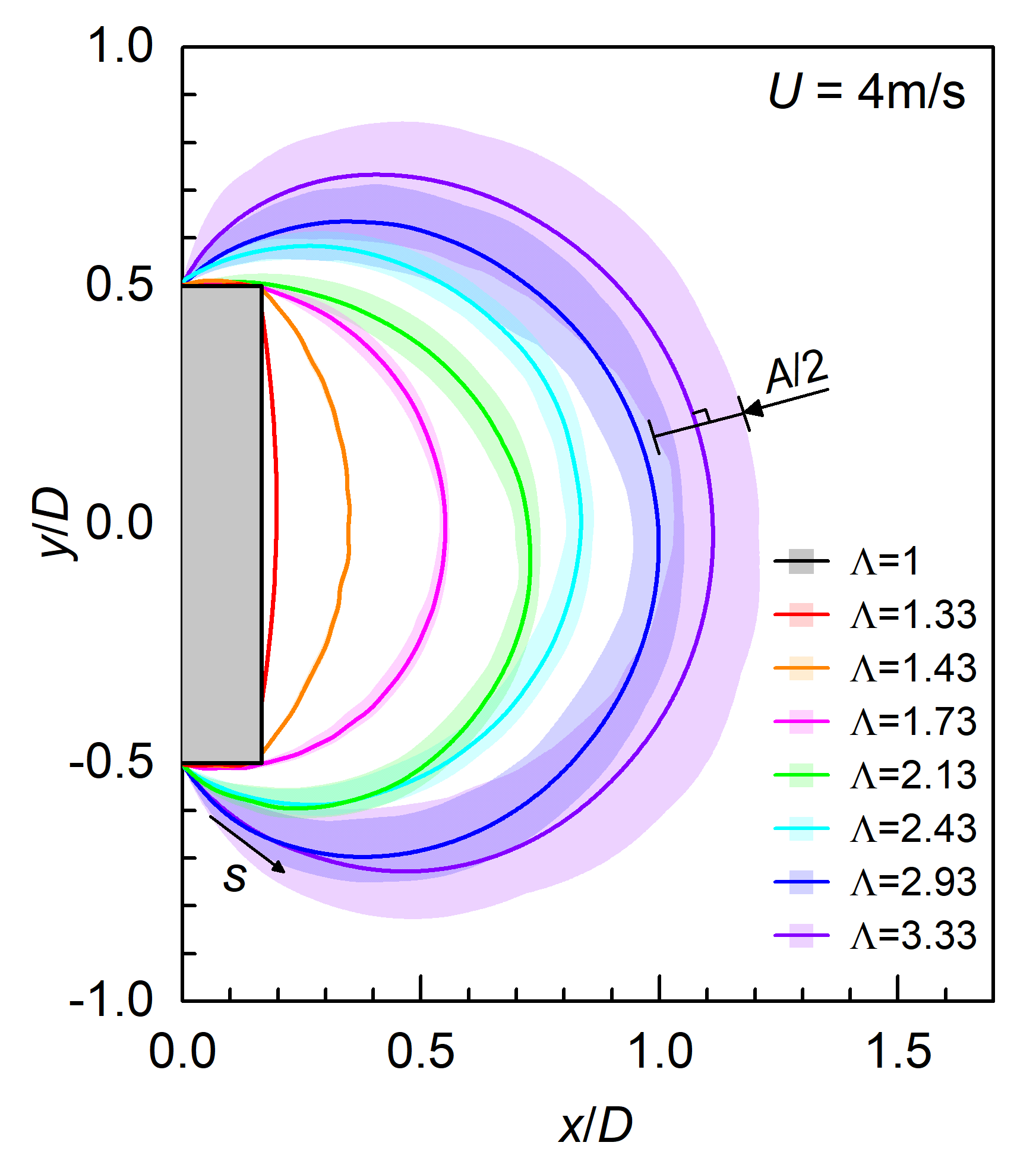 2020年,该小组首次提出了为钝体穿“裙子”来减阻的方法(简称“软尾减阻”),即通过柔性薄膜包裹钝体使其“伪装”成流线体从而实现减阻 [1,2]。前期肥皂膜水洞实验证明了二维流场中最高约为10%的减阻效果。此后,国内外多个研究团队[3-5]及该小组[6,7]分别独立采用数值模拟方法,深入分析了二维场景下“软尾减阻”的物理机制和多种参数的影响。但是,该减阻方法能否用于实际工程,一直未获直接回答。