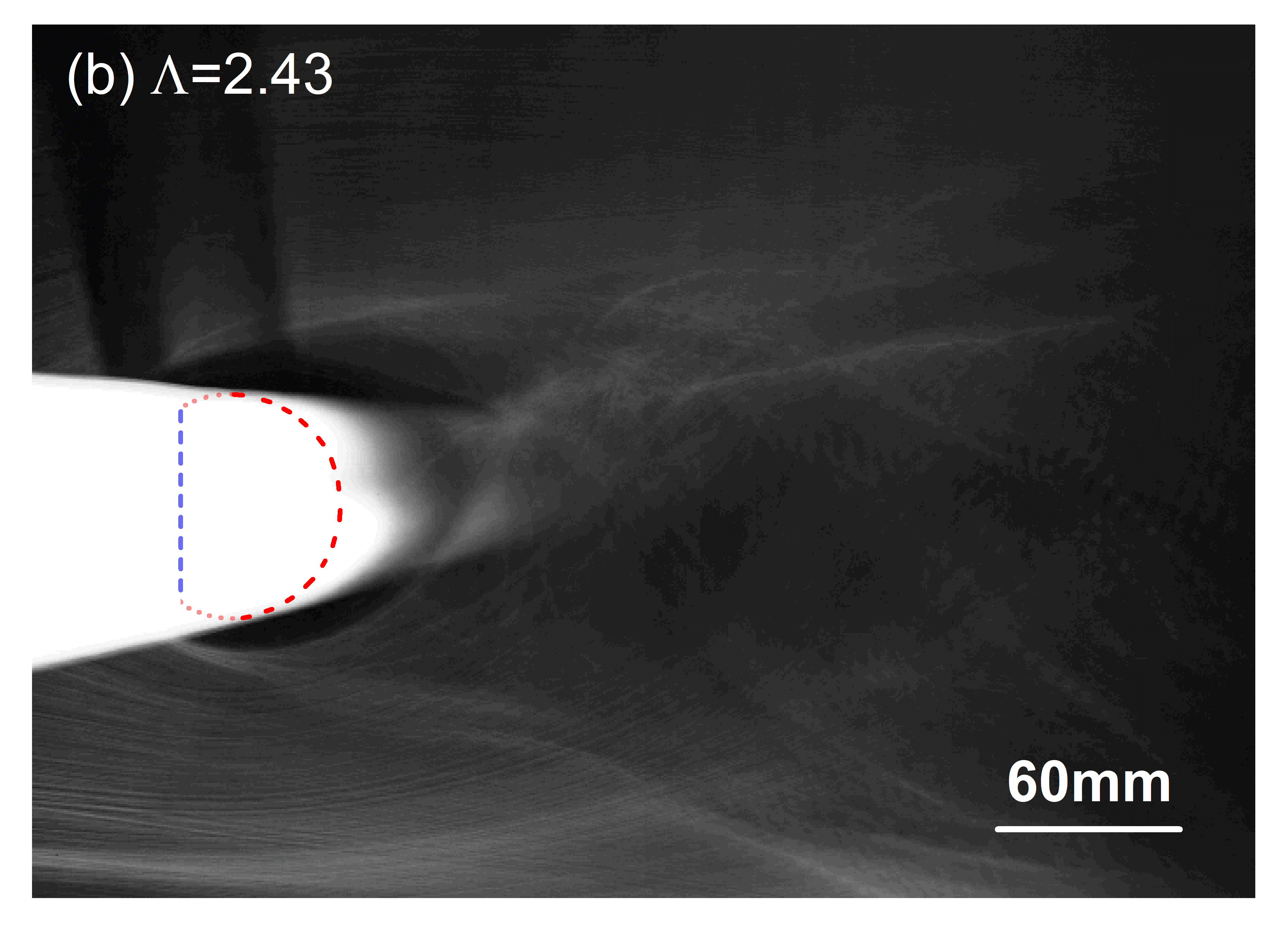 实验表明,给一个三维平板“穿上”柔性薄膜“裙子”,减阻效果最高可达22.2%(见图2左)。值得注意的是,“裙子”的长度只有恰到好处才能减阻。如果穿得过长(>3.0)或者过短(<2.1),不仅不会减阻,甚至会增阻。风洞实验中发现的最佳减阻软尾长度为2.4,与之前二维肥皂膜实验所得出的2.3非常接近,由此佐证了二维肥皂膜实验惊人的深层物理机制刻画能力。实验中发现,柔性薄膜可在风的作用下自然形成较为丰满的D型形态(见图2右),并伴随着泄涡过程在薄膜表面形成一种行波特征,以特定的频率和幅度抖动。这种自适应的薄膜形状和薄膜的拍动运动延迟了流动分离,显著减小了尾流宽度,从而降低了系统所受流体阻力(图3)。