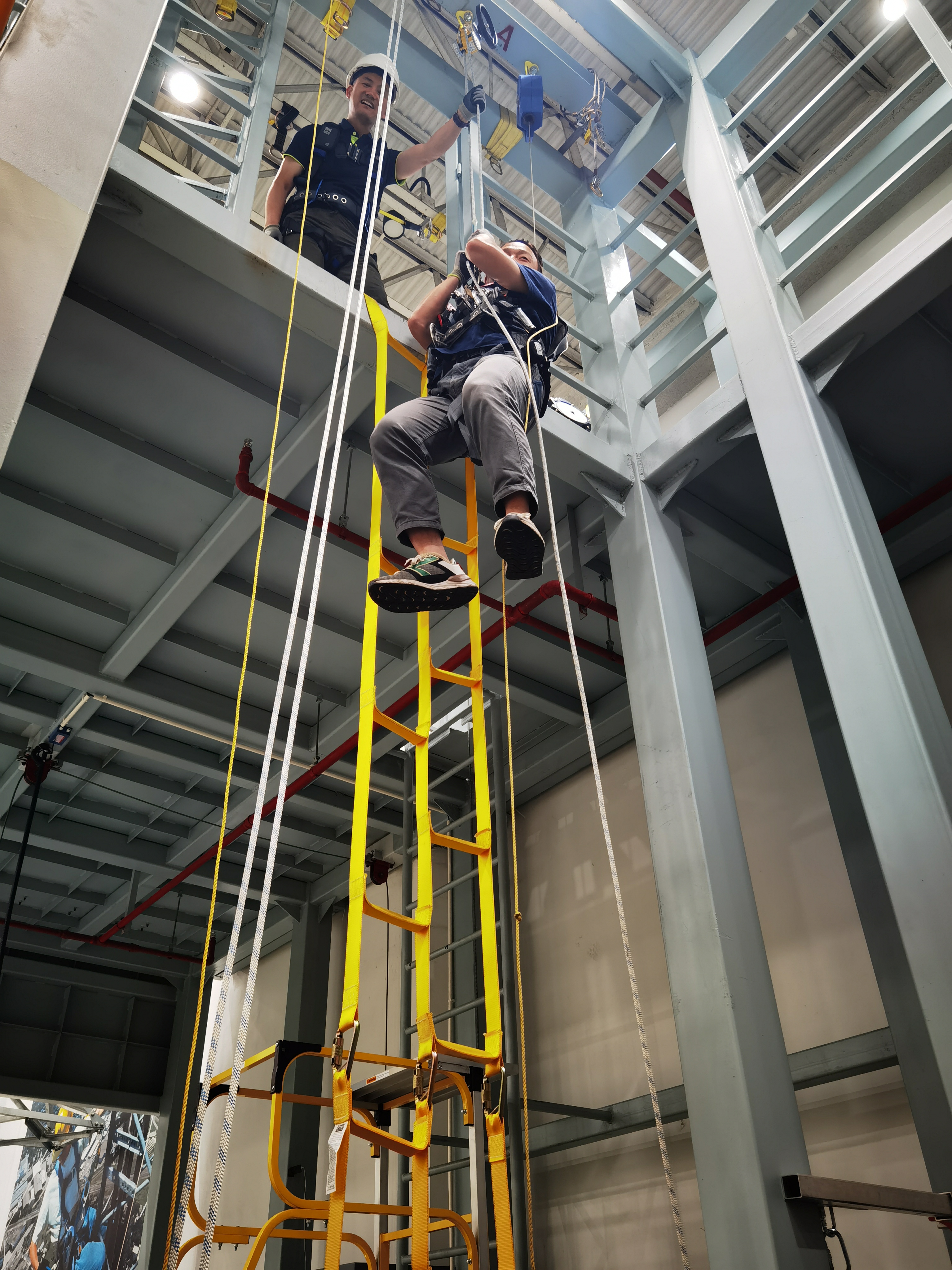 理论培训结束后,参训师生在实训场地进行了登高和坠落防护的实操演练。参训人员在认真学习各类安全带的穿戴培训后,积极参与挑战各类安全带的专业穿戴,并实际吊起体验各类不同的安全带的防护能力,进一步认识安全防护的重要性。最后各实验室师生实际开展了攀爬登高和下落作业的实操演练。在紧张严肃又欢乐有趣的氛围中,参训师生切实掌握了高处作业的各类专业技能,进一步提高了安全意识和应急处置能力。