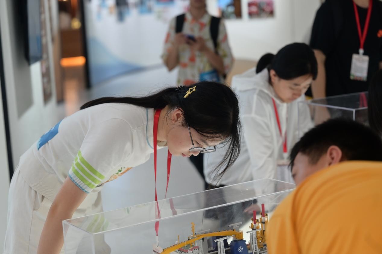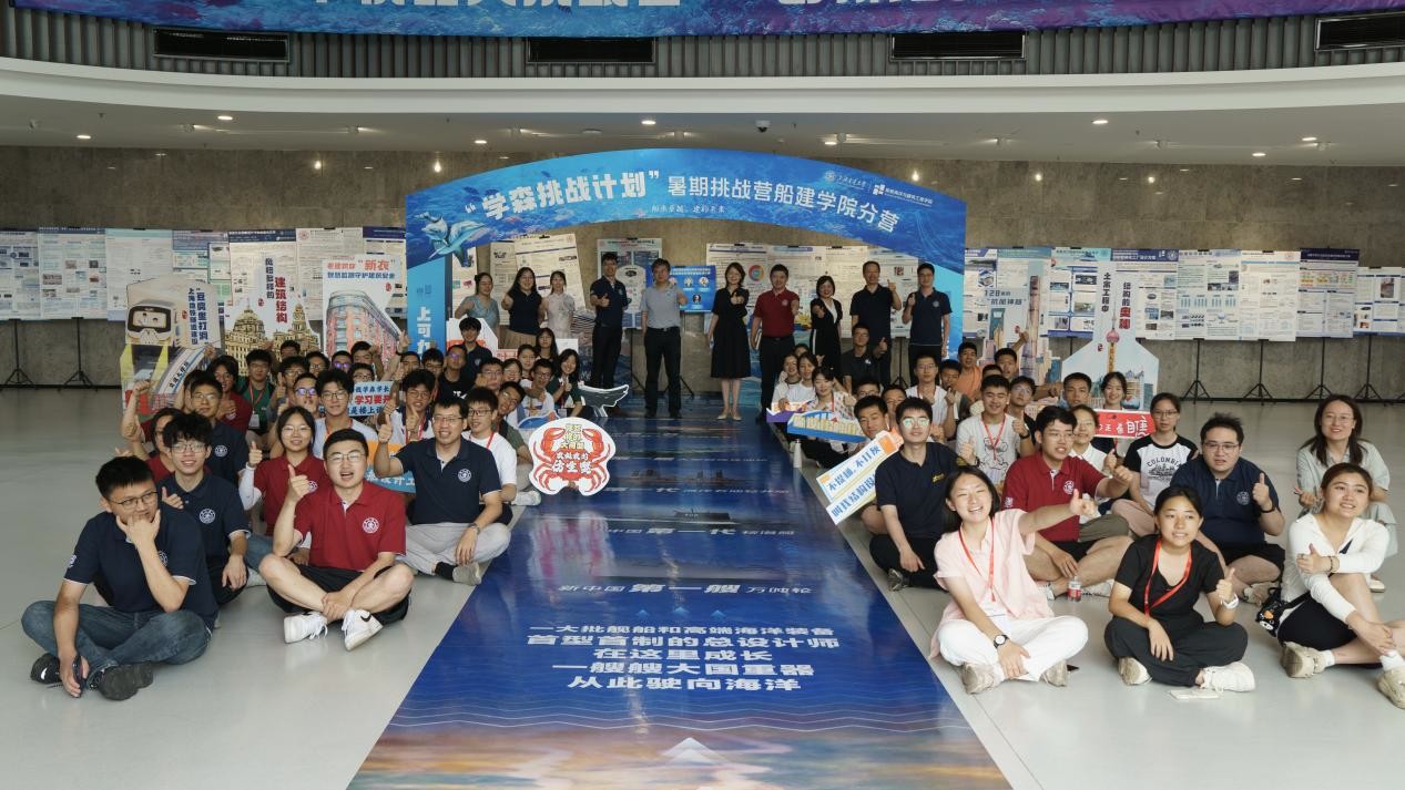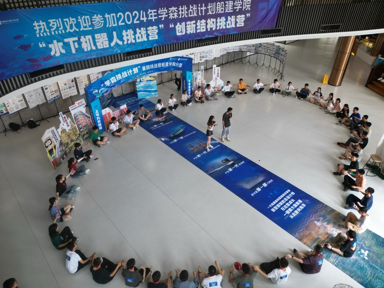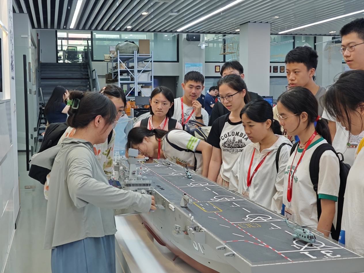 同学们步入船建51风流 木兰楼大厅,映入眼帘的是由船建校友设计的我国各类首型首制舰船和海洋装备以及一排排特色结构建筑。《船舶与海洋工程导论》《船舶智能制造》《力学创新实验》等课程项目作品也一同亮相。炎热的夏日里,同学们仿佛置身蓝色海洋,一场别开生面的破冰游戏将同学们的热情点燃。