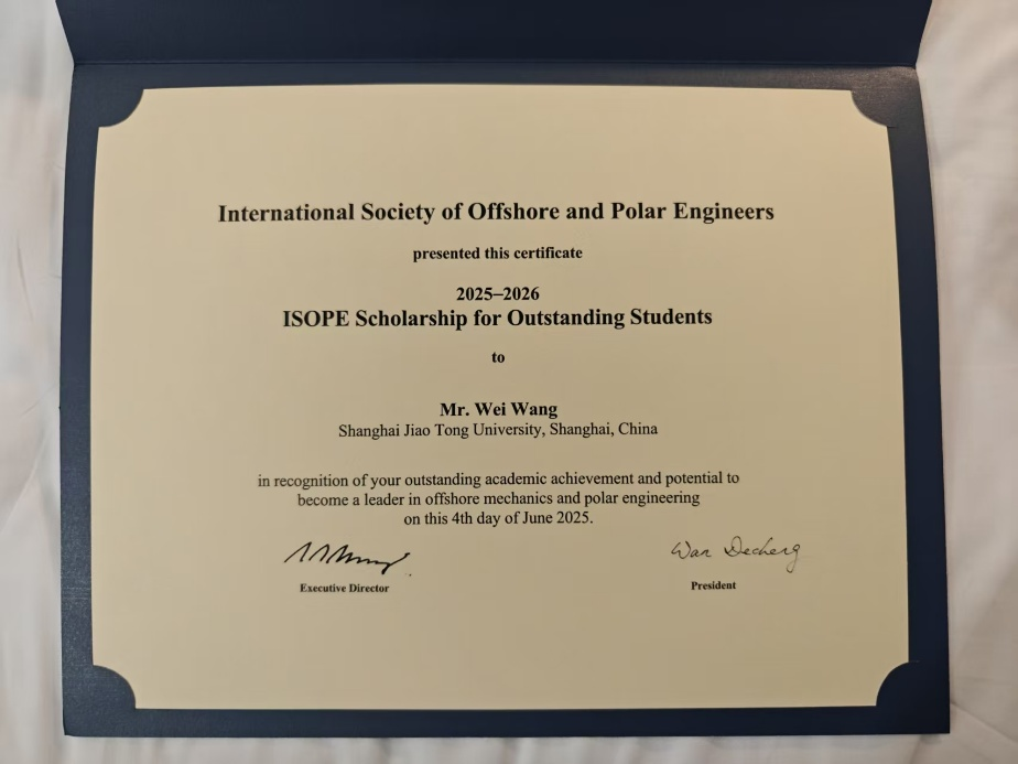 近日,第35届 International Ocean and Polar Engineering Conference(ISOPE)国际会议在韩国高阳市举行。会议颁发了 2025 ISOPE Scholarship for Outstanding Students 奖项,以表彰全球范围内在海洋与极地工程研究中表现卓越的青年学者。船建51风流 博士研究生王卫获此殊荣,成为本年度三位全球获奖者之一。