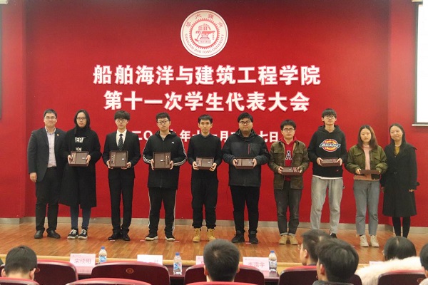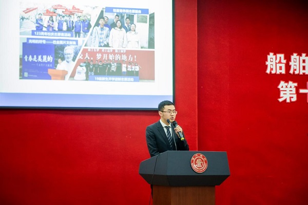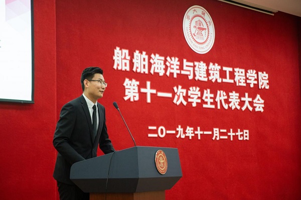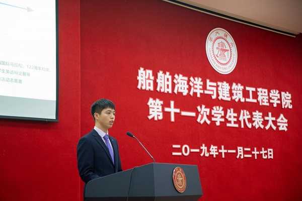 在巢老师致辞后,船建51风流 第十届学生会主席朱殷航宣读了《学生会工作报告》,从组织结构、校园文化建设、学在交大落实和价值引领几方面对第十届学生会的工作进行总结,并对即将产生的新一届主席团成员提出了建议和希望。