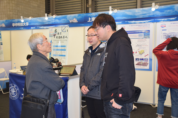 展会期间,学生展台受到了专业观众广泛关注,其中赵国成、马昭、赵伟杰团队的《基于漩涡水动力特性的触须集群式海底集矿装备》、娄建坤、欧阳子路、向金林、王昱淇、王申涛团队的《追梦三号·智能无人船艇》吸引了许多嘉宾驻足了解,观众络绎不绝。中国造船工程学会李国安副理事长到展台了解学生作品情况并与师生合影留念。