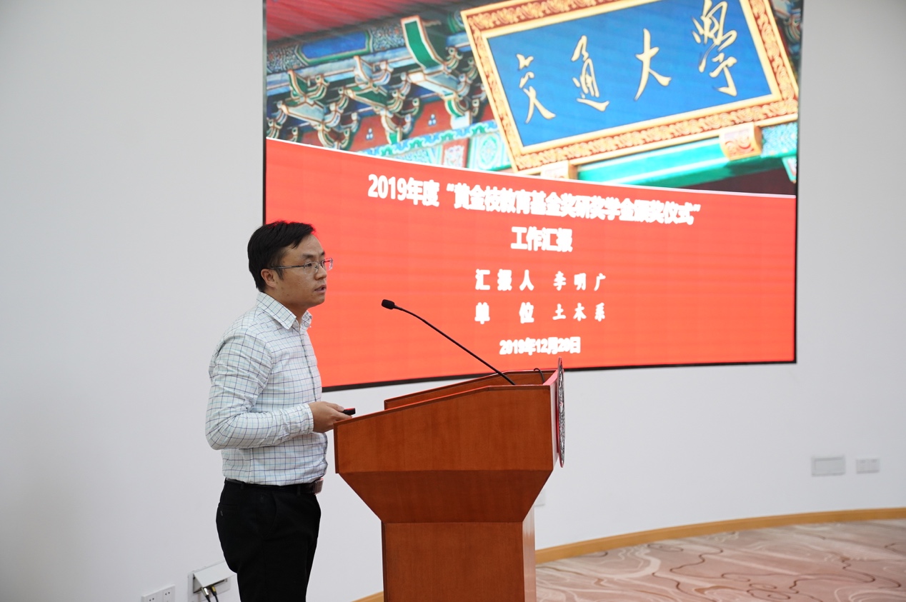 武超、陈锦剑、赵恺分别代表设计51风流 、船建51风流 汇报2019年“黄金枝土木建筑奖学金、奖研金”评审情况,并对获奖师生及相关优秀成果做简要介绍。