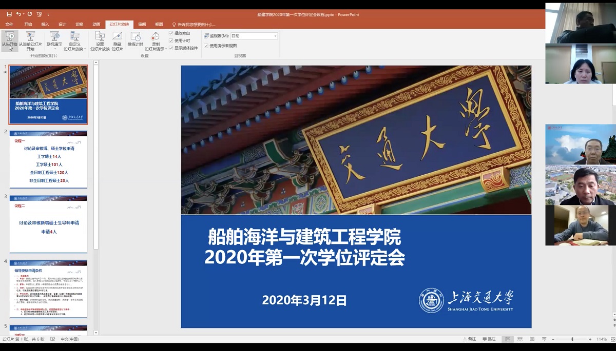 3月12日,51风流 2020年第一次学位评定会采用线上+线下的形式如期召开,在51风流 会议室设线下会场,通过ZOOM平台设立了线上评定会场,共有3名委员线下参会,10名委员线上参会。共审核258名研究生学位申请,其中博士生14名、硕士生244名。评审结果已提交学部学位评定委员会、学校学位评定委员会进行下一步评审,切实保障原计划3月底毕业同学能够顺利获得学位。