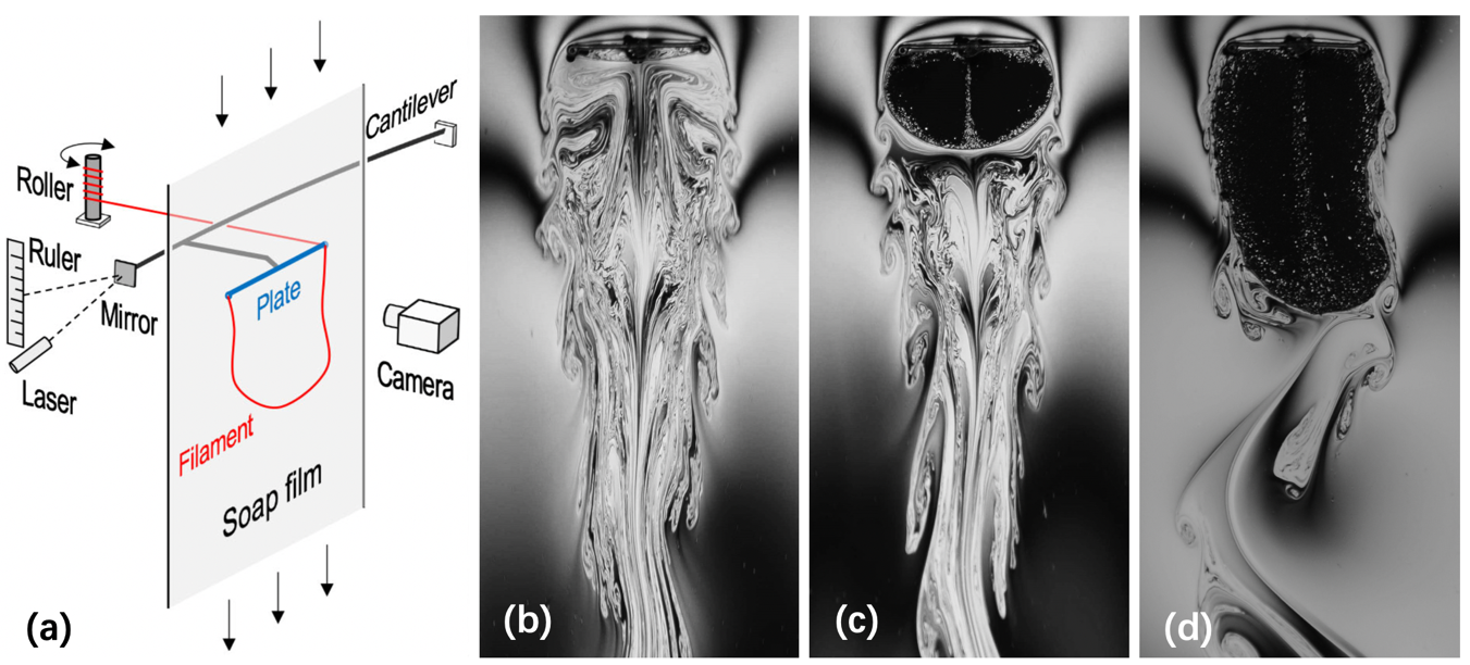 2018年4月起,田新亮研究小组采用实验方法逐步证实了“软尾减阻”猜想,并建立理论模型深入探讨其背后的物理机制。首先,他们搭建了竖直流动肥皂膜实验系统“SJTU-FILM”,实现了对准二维流场的稳定模拟;然后,在尝试了多种柔性材料后,成功构造了“刚性平板-柔性细丝”耦合系统并将其置入“SJTU-FILM”中,形象地模拟了“穿着披风”的钝体在流场中运动的场景。为了确保获得高质量的实验数据,他们还自行研制了精度高达0.01毫克的测力装置,发明了连续调节柔性细丝长度的方法,成功实现了在不中断肥皂膜流动条件下的连续稳定测量(图3)。