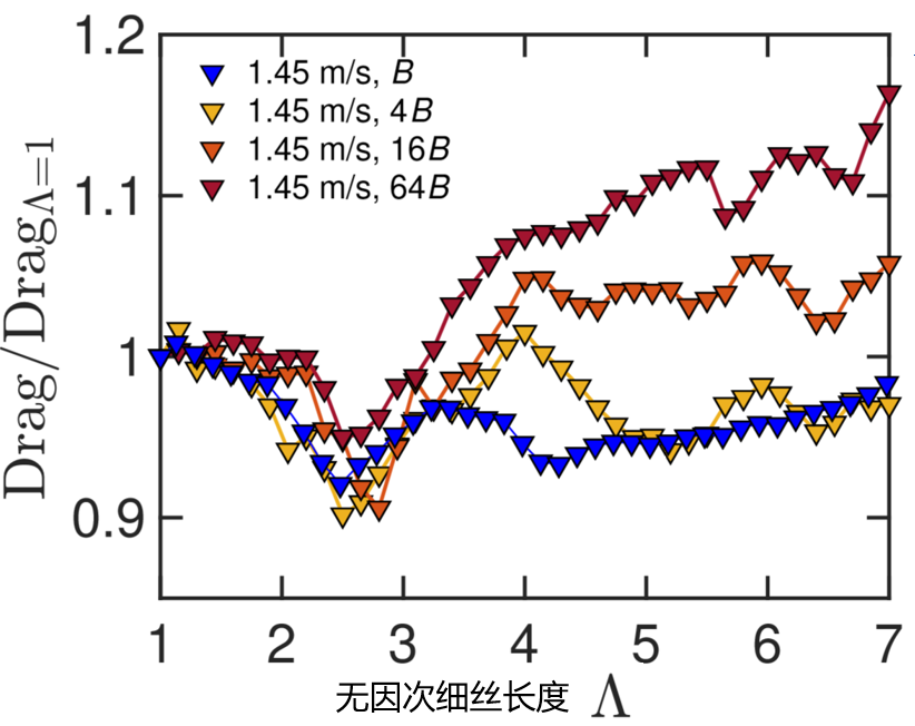 图4 不同刚度的细丝在不同长度下的减阻效果(流速为1.45米每秒)。