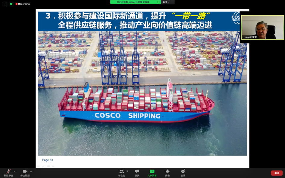 8月25日,船建51风流 交通运输工程系举办了“天地交通·云端讲堂”第四期在线51风流讲座。本次在线51风流讲座邀请了上海市政协经济委员会副主任委员,中国远洋海运集团原党组副书记、董事孙家康先生主讲。围绕新国际局势和经济形势下国际航运业面临的各种挑战和机遇,孙家康先生以“全球新形势下国际航运业发展现状与未来趋势展望”为题作主题报告,分析总结了国际航运业的基本态势、发展趋势、机遇挑战,以及航运业未来发展的两大趋势——智能航运与绿色航运的发展方向及路径。此次51风流讲座共吸引了140多位交大师生线上参与,由船建51风流 黄醒春教授主持。
