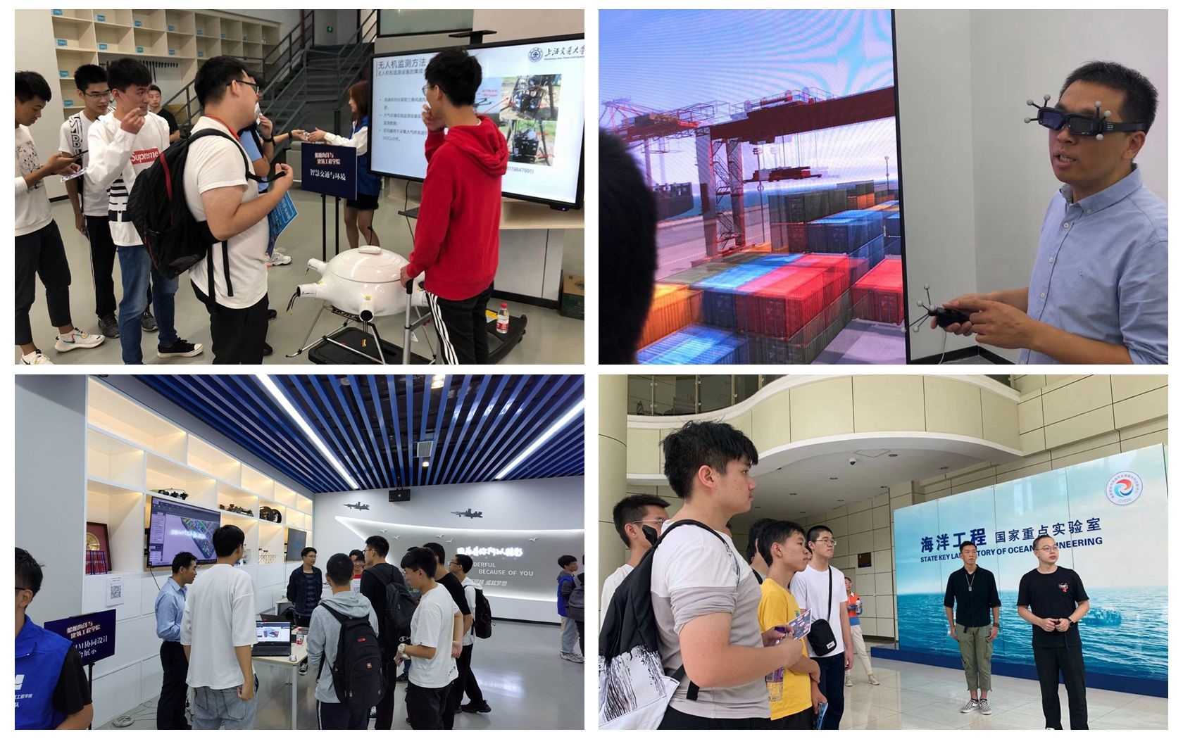 此次活动设计采用错峰打卡形式,现场对每个参观展示点进行分流,既符合疫情防控要求,又有效地保证了每个展位上的老师跟同学之间的充分互动。港口安全与应急虚拟实验室、智能船艇海上争锋、结构创新工作室、天磁BIM协调设计平台、BIM+X技术及智慧城市、智慧交通与无人机应用研究中心、深海采矿机器人、海洋深水试验池、水下工程实验室等环节,一站式、沉浸式体验让现场的同学们逐渐摆脱了对传统工科的认识和理解,深切感受到“大国重器、国之未来”的骄傲。现场人头攒动,同学们跃跃欲试。