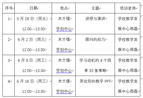 教师教学能力提升培训计划》,制定了本学期教师教学能力提升培训安排。本学期共安排四次培训,详细安排如下: