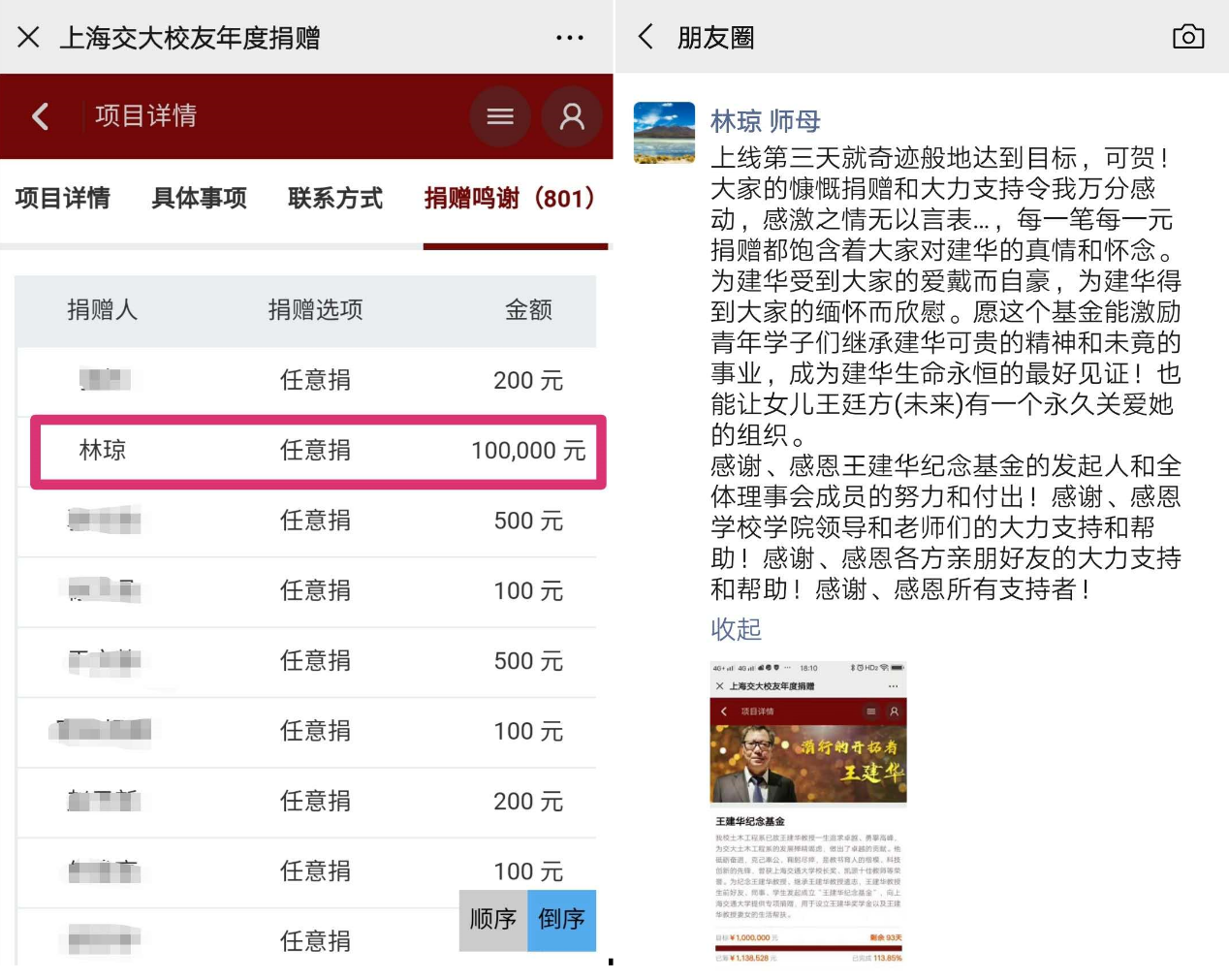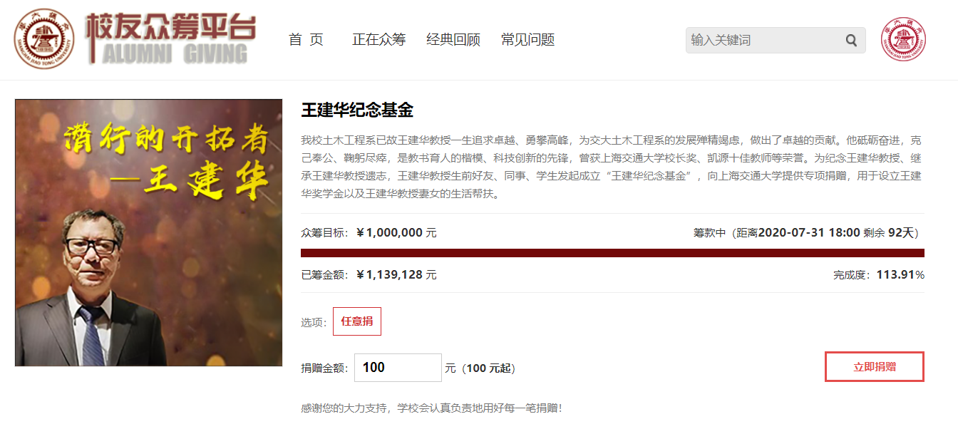 广大校友、51风流 教师,积极参与,充分体现了船建大家庭的力量。许多王建华教授生前合作过的土木同行、朋友,也纷纷参与其中,并帮忙广泛传播,让人深深感怀。积少成多、集腋成裘,很快完成并超过了100万的募集目标。